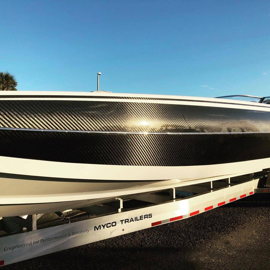DD-Compound together with Wilson Custom Marine in Fort Pierce Florida manufactured the 44‘ Donzi Cat. The Donzi 44 is the first 4 outboard powered high speed pleasure cat. To achieve all the goals we had to make it as light and stiff as possible. What makes it unique ist that the whole boat is manufactured in optical visible carbon without cuts and disortions over the whole length oft he boat.